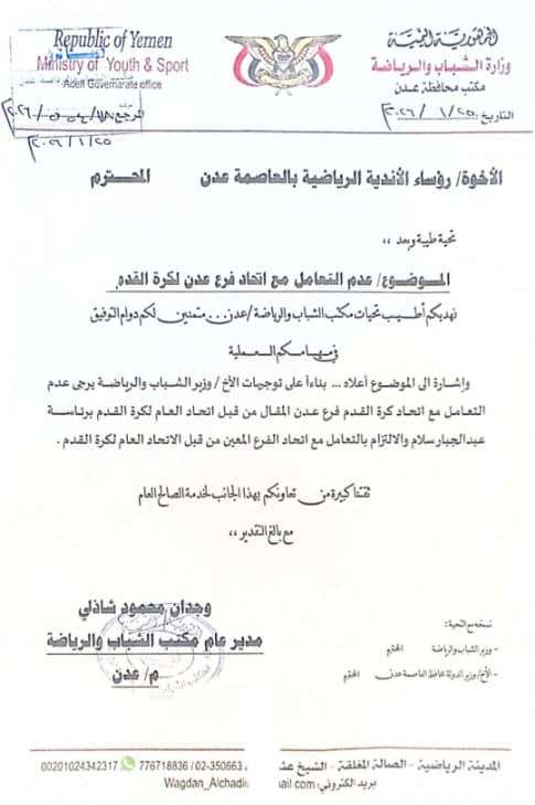 أصدر امس الأحد، مكتب الشباب والرياضة بالعاصمة المؤقتة عدن، تعميمًا للأندية الرياضية بعدن جاء فيه : بناءً على توجيهات وزير الشباب والرياضة يرجى عدم التعامل مع اتحاد كرة القدم فرع عدن المقال من قبل الاتحاد العام لكرة القدم برئاسة عبدالجبار سلام، والإلتزام بالتعامل مع اتحاد الفرع المعين من قبل الاتحاد العام لكرة القدم.